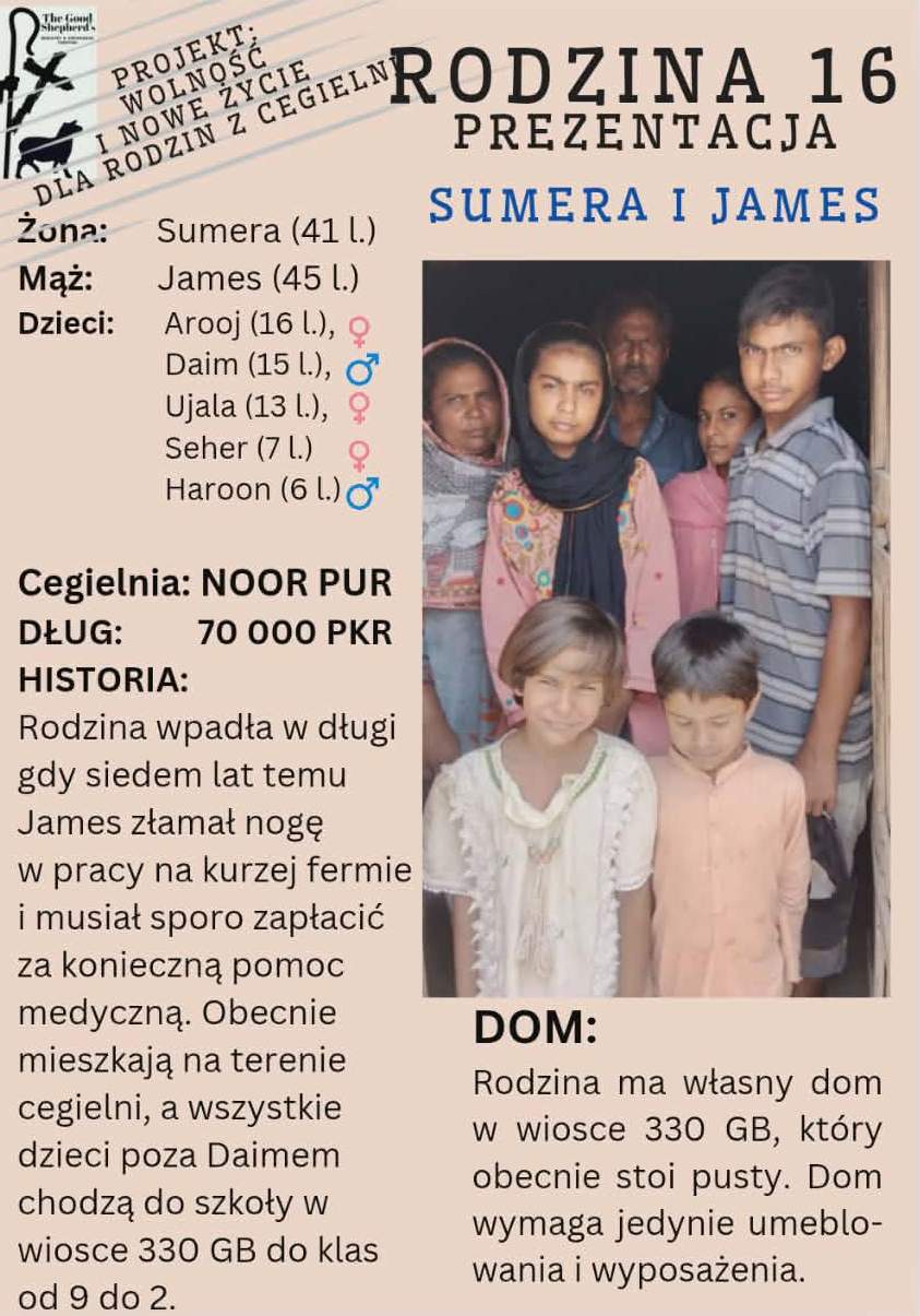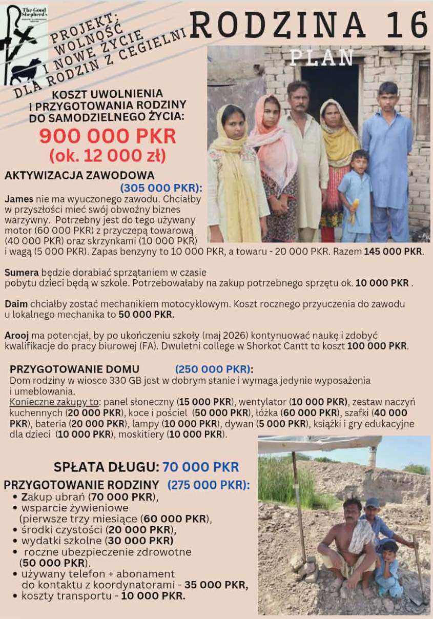 Chcieliśmy przedstawić Państwu aktualizację naszego projektu kompleksowej pomocy dla rodzin z fabryk cegieł. Na dzień dzisiejszy do projektu zakwalifikowaliśmy 14 niewykupionych jeszcze rodzin będących pod opieką Duszpasterstwa Dobrego Pasterza w Pendżabie. Koordynatorami projektu jest chrześcijańskie małżeństwo Sajida i Ashbeel Raifq, którzy podjęli się tego trudnego zadania z pełną świadomością, jak wiele pracy ich czeka przy tym projekcie i przygotowali wszystkie przedstawione w projekcie dane. Na załączonych zdjęciach zostały ujęte wszystkie najważniejsze szczegóły dotyczące każdej z 14. rodzin zakwalifikowanych do programu kompleksowej pomocy obejmującego uwolnienie i przygotowanie rodziny do samodzielnego życia, w tym przede wszystkim: