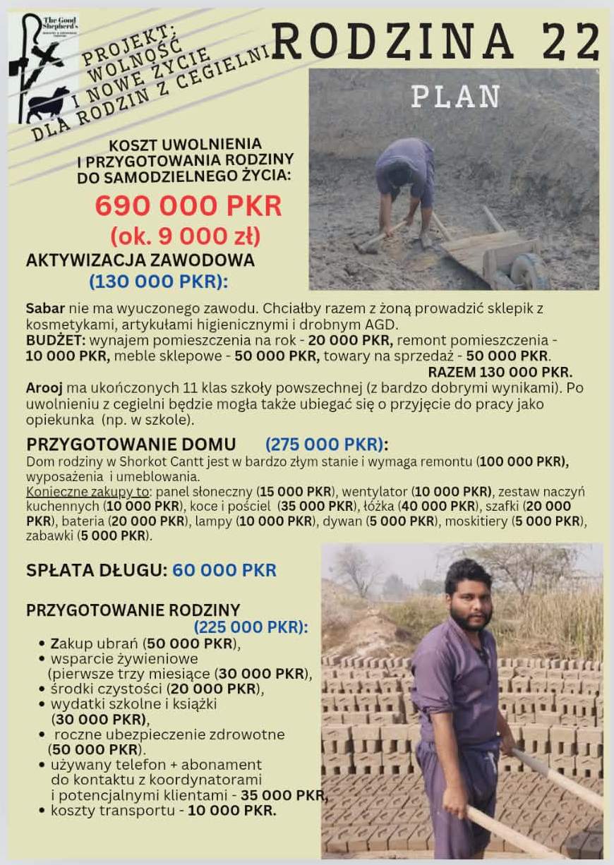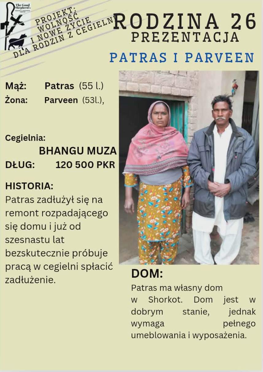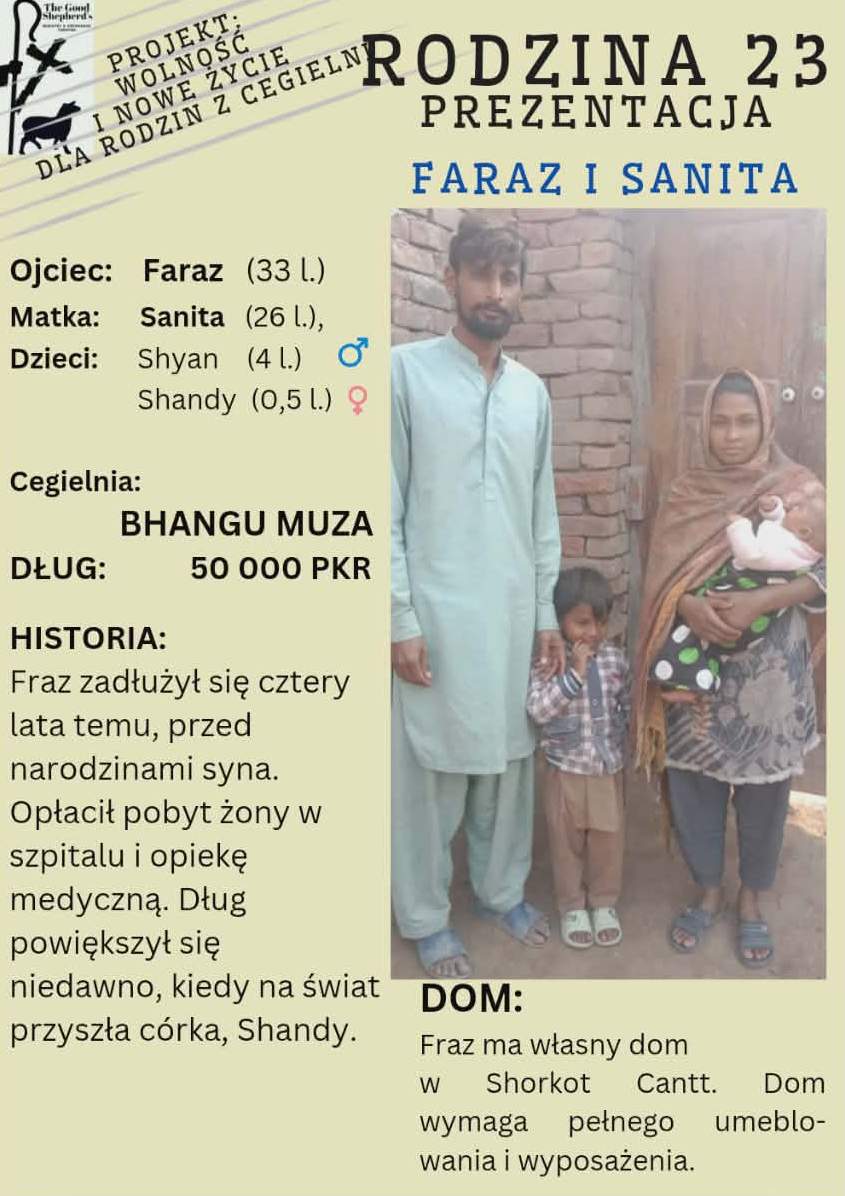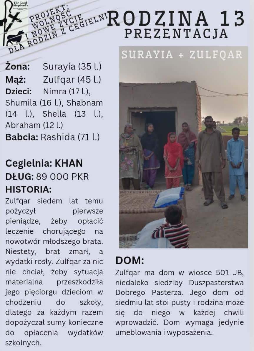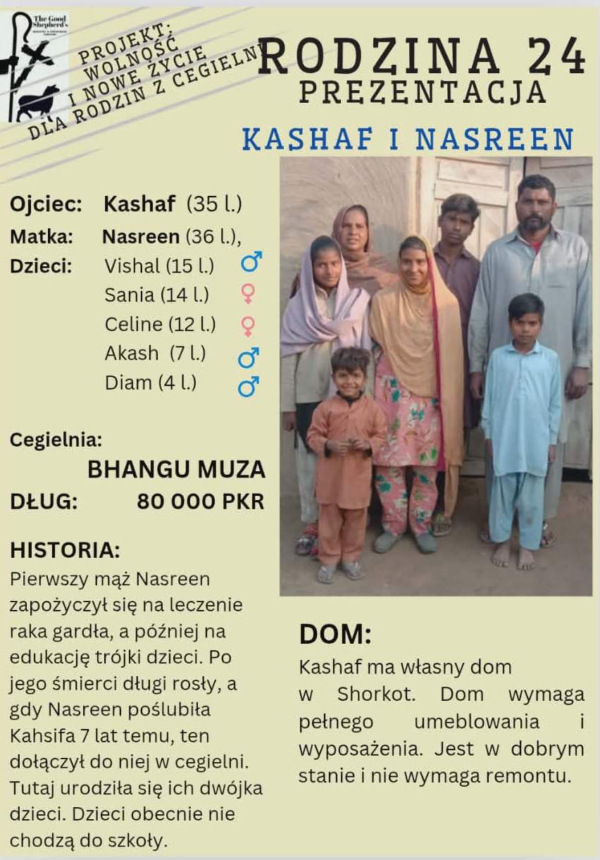 Chcieliśmy przedstawić Państwu aktualizację naszego projektu kompleksowej pomocy dla rodzin z fabryk cegieł. Na dzień dzisiejszy do projektu zakwalifikowaliśmy 12 niewykupionych jeszcze rodzin będących pod opieką Duszpasterstwa Dobrego Pasterza w Pendżabie. Koordynatorami projektu jest chrześcijańskie małżeństwo Sajida i Ashbeel Raifq, którzy podjęli się tego trudnego zadania z pełną świadomością, jak wiele pracy ich czeka przy tym projekcie i przygotowali wszystkie przedstawione w projekcie dane. Na załączonych zdjęciach zostały ujęte wszystkie najważniejsze szczegóły dotyczące każdej z 12. rodzin zakwalifikowanych do programu kompleksowej pomocy obejmującego uwolnienie i przygotowanie rodziny do samodzielnego życia, w tym przede wszystkim: